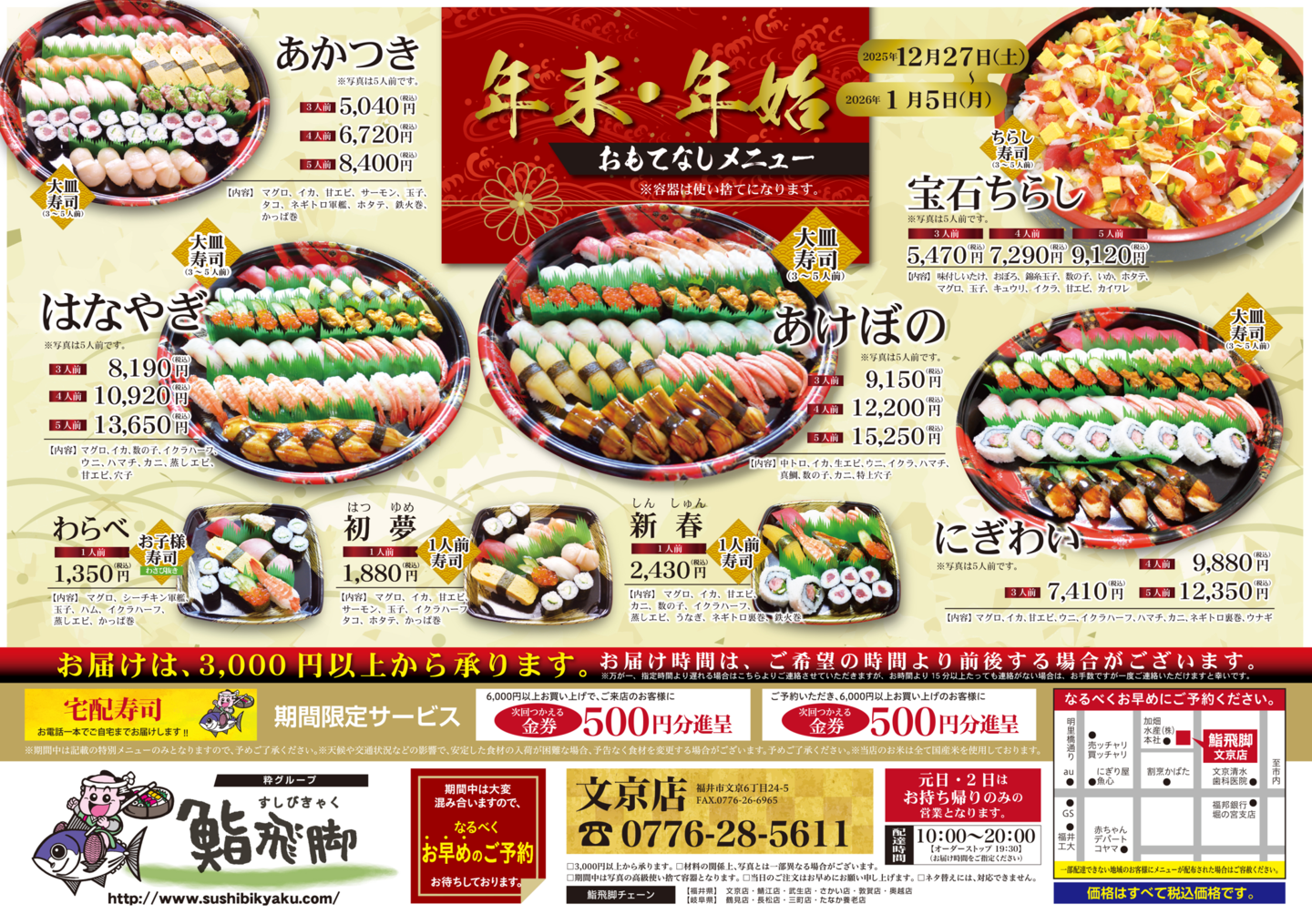 文京店 ,269efa1b-bc0f-47de-9aba-ad753cf22d10,,{"tempId":"light","gmapWidth":"100","gmapWidthUnit":"%","gmapHeight":"450","gmapHeightUnit":"px","gmapZoomLevel":18,"gmapScrollWheel":false} 文京店 ご注文はこちら⇒0776-28-5611 営業時間:午前10時〜午後8時30分(電話受付は午前9時から。午後1時30分〜午後3時30分は準備中) お正月メニュー 文京店 12月27日~1月5日まで 旬 文京店 12月1日~2月28日 各メニュー 画像をクリック 各店舗 ページトップへ